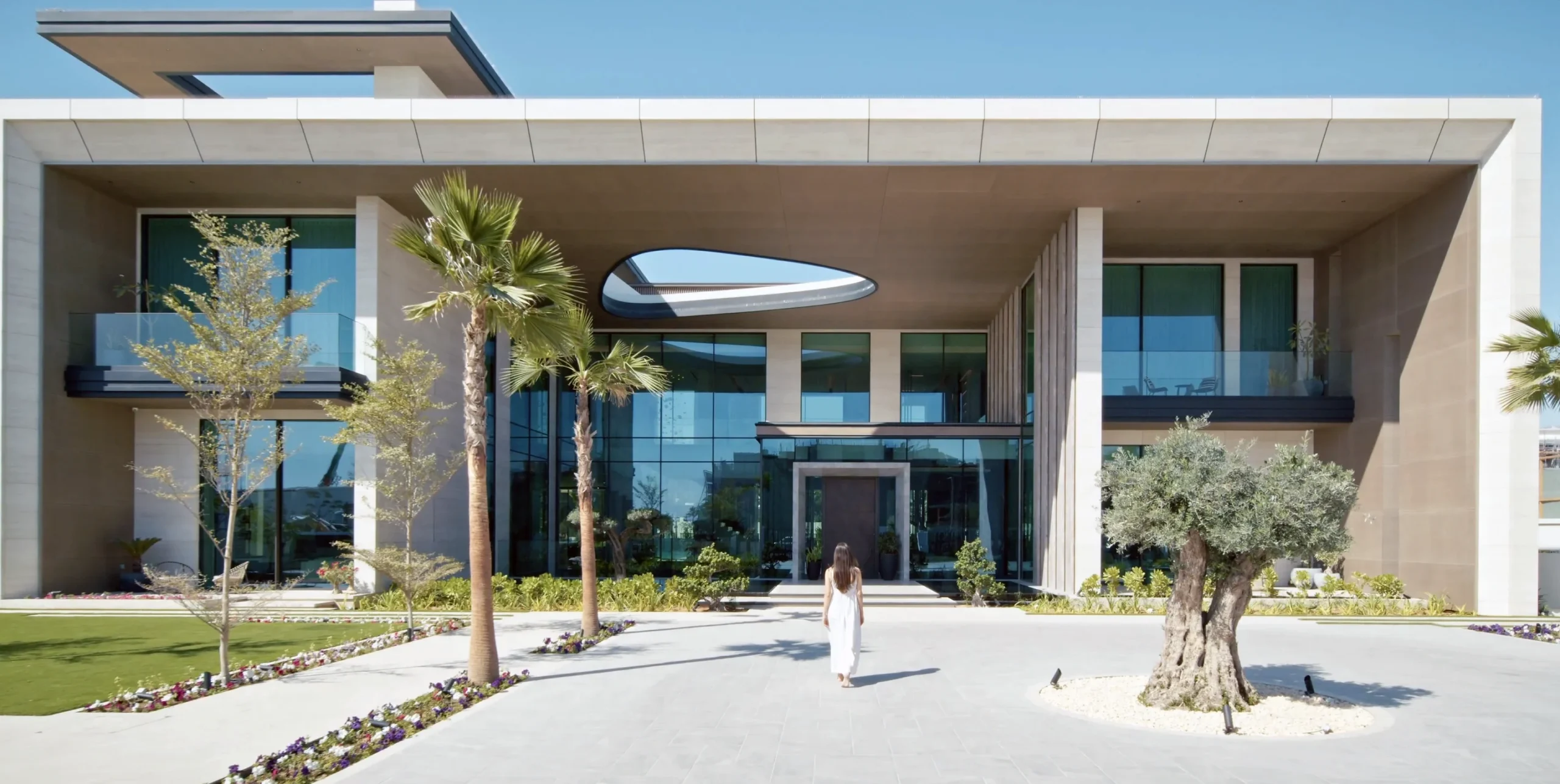 This villa showcases a striking glass façade and a sculptural floating staircase that defines its modern character. Designed for seamless indoor-outdoor living, the home balances openness with warmth. Interior styling by MWM Studio elevates the atmosphere, blending refined materials and contemporary elegance into a cohesive, inviting residential experience.